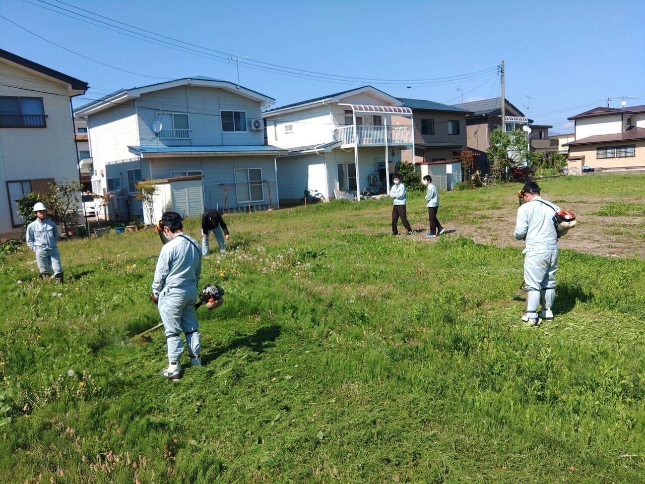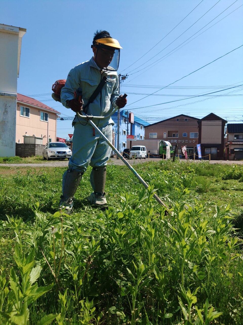 高校生の草刈り機の刃は金属製ではなくナイロン製のひもです、危険性が少なくなるように配慮しています。